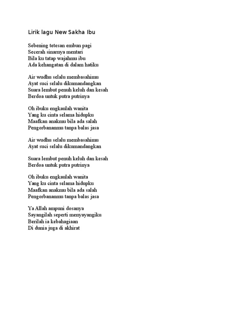 Oh bunda ada dan tiada Dirimu kan selalu ada di dalam hatiku. Lirik Ibu dari New Sakha ini dipublikasikan pada tanggal 22 Desember 2010 11 tahun yang laluBelum ada info detil tentang single ini. Ohtidak kulupa Erti kehidupan Ibu dikaulah Yang tersayang Akan hukum Pegangannya Tidak kulupa Suruhan Yang Esa Lagu.