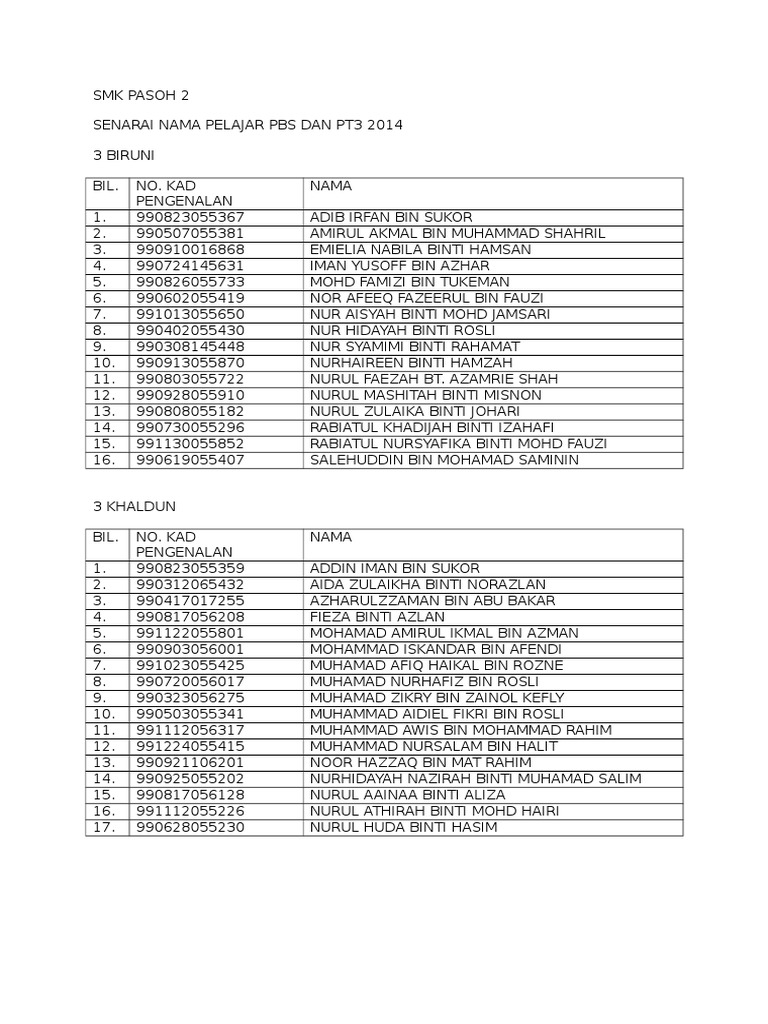 Senarai Nama Pelajar Pbs Dan Pt3 2014 Pdf