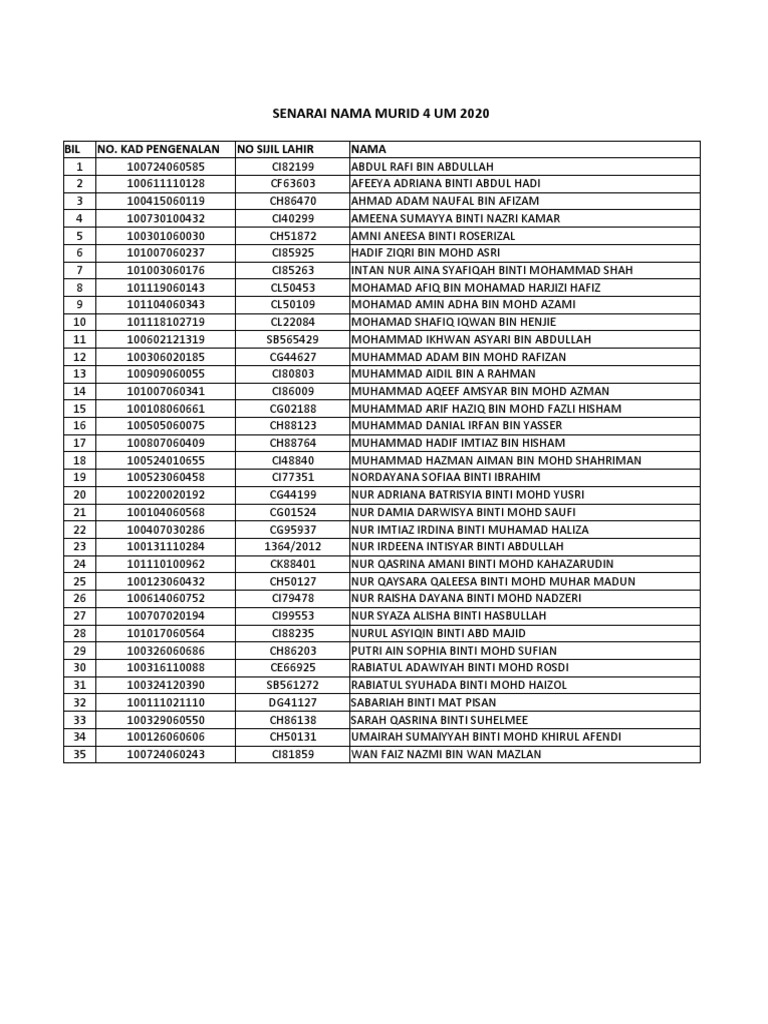 Senarai Nama Murid Tahun 4 2019 Pdf